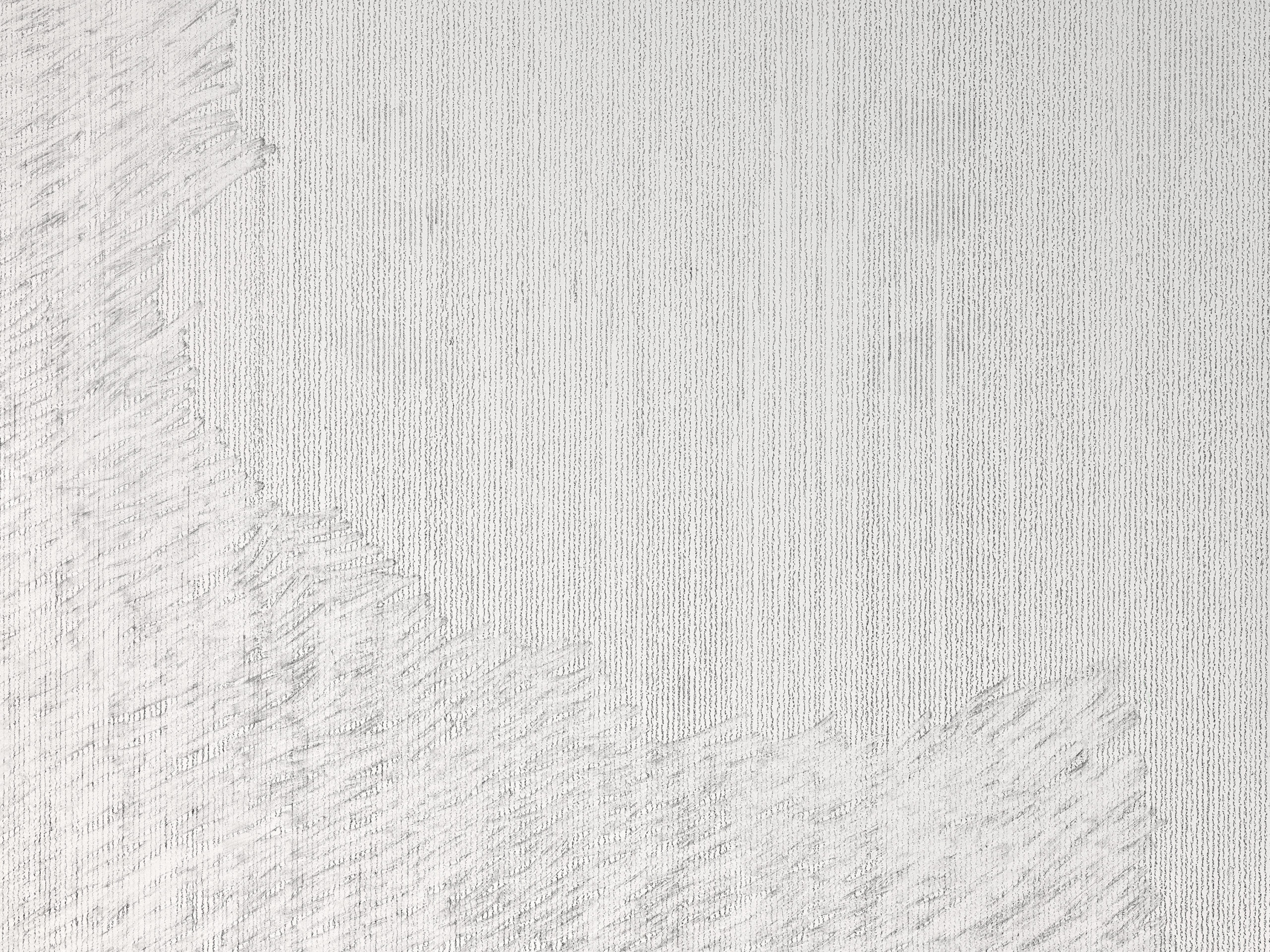 « Erased manifeste l’attention portée à tous les éléments qui composent une œuvre, jusqu’à ses débris. Nicolas Muller trace des lignes au crayon sur le mur, qu’il vient ensuite gommer. Le graphite ne disparaît pas, il est comme étalé, la matière se mélange. L’effacement révèle paradoxalement le dessin, casse le rythme linéaire dans un jeu de perturbation vibratoire de la vision. Échouées au sol, les mines, la poudre de graphite et les pelures de gommes forment une nouvelle matière d’un noir intense. Cette zone résiduelle souligne l’action et l’implication du corps, tout autant que la tension entre les gestes de tracé et d’effacement, d’apparition et de révélation. » Johana Carrier, Le dessin dans les traces, 2023